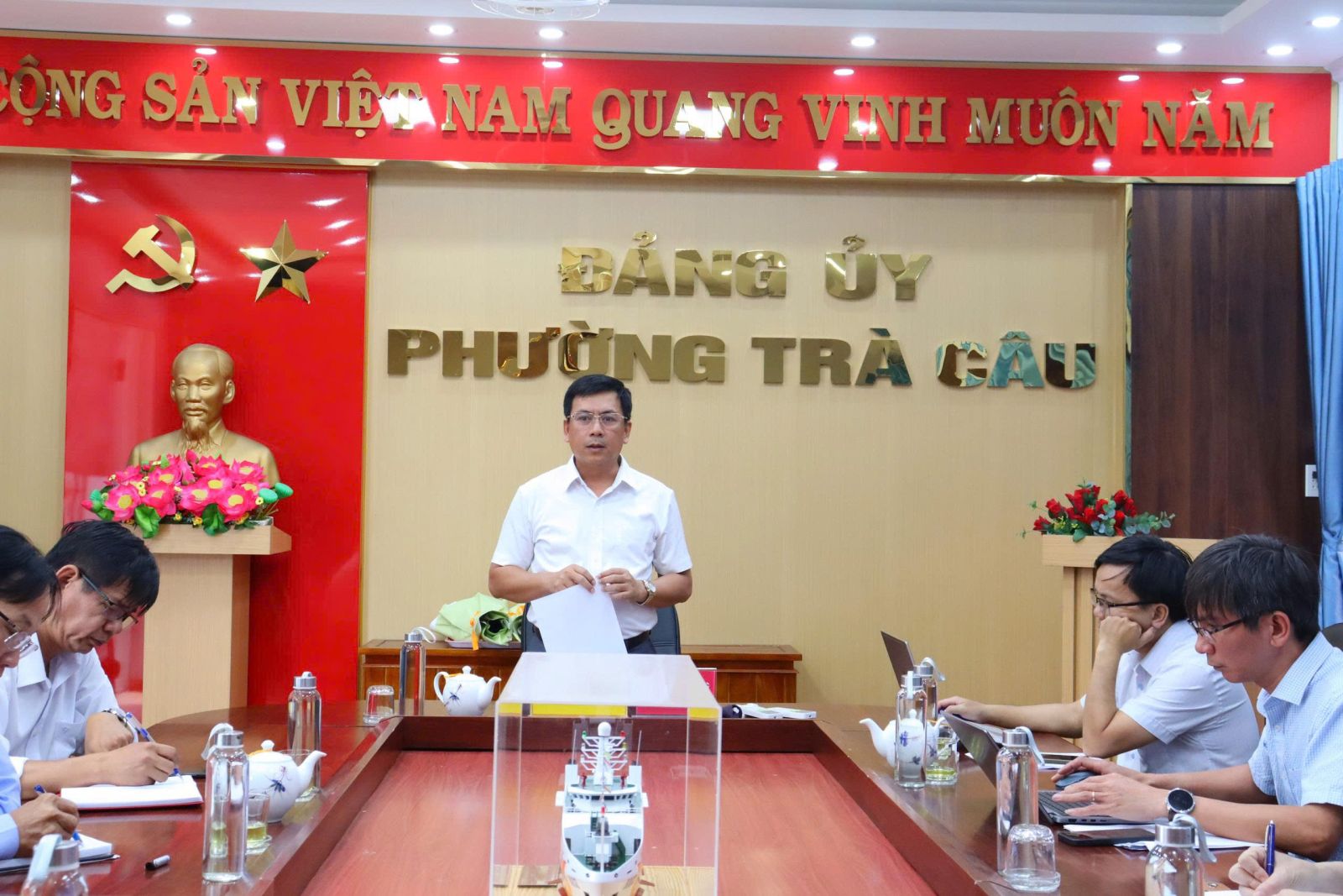 Phiên họp do đồng chí Nguyễn Xuân Văn – Bí thư Đảng ủy, Chủ tịch HĐND phường, Trưởng Ban Chỉ đạo chủ trì. Tham dự cuộc họp có các thành viên Ban Chỉ đạo bầu cử phường.
