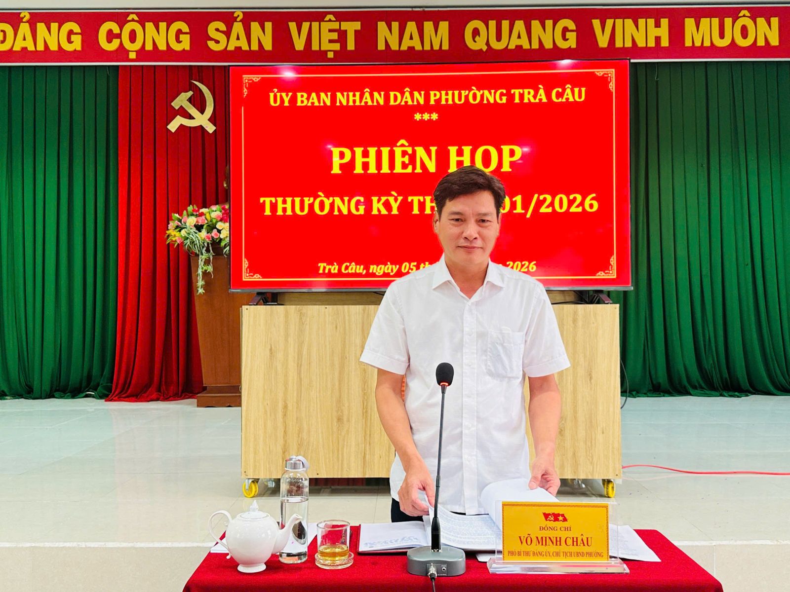Sáng ngày 05/01/2026, UBND phường Trà Câu tổ chức họp giao ban tháng 01/2026 để nghe báo cáo và có ý kiến về một số nội dung thuộc thẩm quyền của UBND phường. Đồng chí Võ Minh Châu - Chủ tịch UBND phường chủ trì cuộc họp.
