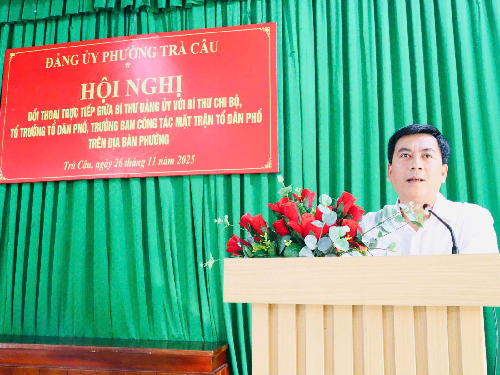 Sáng ngày 26/11/2025, tại hội trường Đảng ủy phường, Đảng ủy phường Trà Câu tổ chức Hội nghị đối thoại trực tiếp giữa Bí thư Đảng ủy với Bí thư chi bộ, Tổ trưởng tổ dân phố, Trưởng ban công tác mặt trận các tổ dân phố trên địa bàn phường để lắng nghe những tâm tư, nguyện vọng và kịp thời giải quyết những kiến nghị chính đáng từ cơ sở. Đồng chí Nguyễn Xuân Văn – Bí thư Đảng ủy, Chủ tịch HĐND phường chủ trì hội nghị.